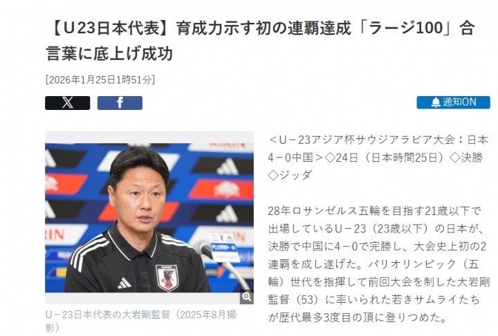 直播吧01月25日讯 U23亚洲杯决赛,日本队4-0击败中国队夺冠。赛后报道中,数家日媒都着重提到了“大100人计划”这个口号。